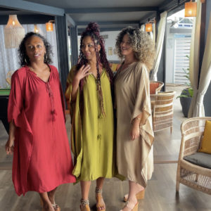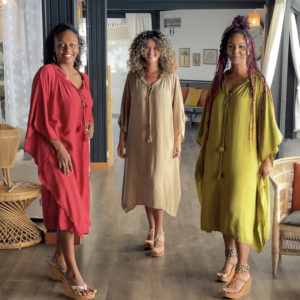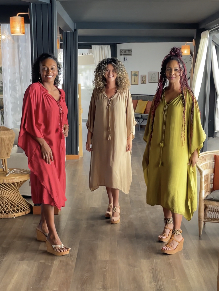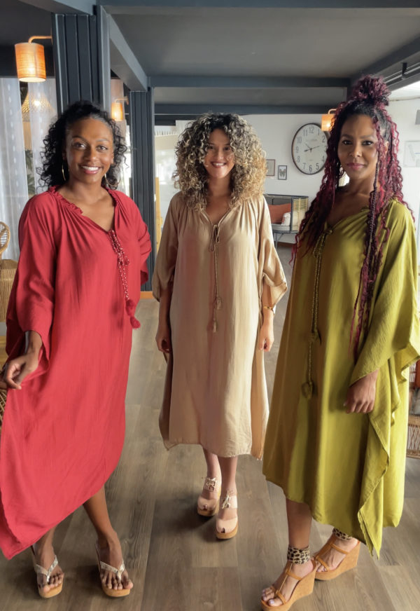 Robe kaftan fluide et ample avec un grand col V et deux cordons (avec des détails dorés) à nouer à l’avant.